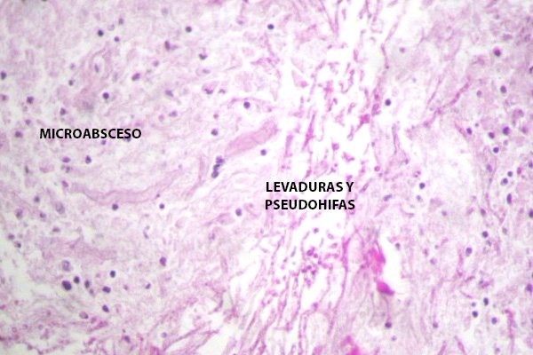 Se aprecian neutrófilos migrando a través de la epidermis y formando microabscesos en el estrato córneo o subcórneo, adyacente al cual se reconoce el hongo (Cándida sp).