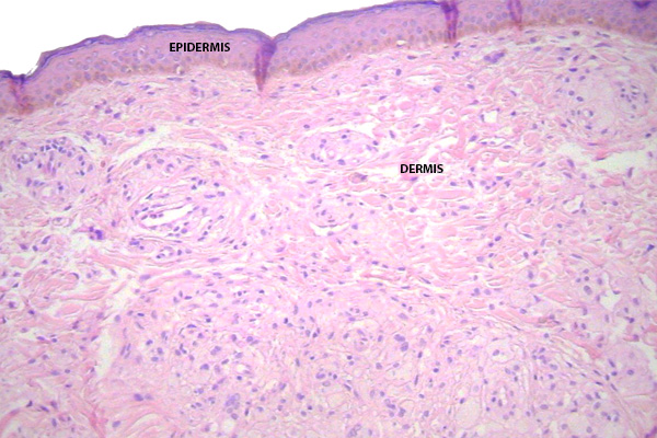 Segmento de piel palpebral, desprovista de anexos pilosebáceos, muestra rectificación del epitelio e hiperpigmentación de la capa basal.