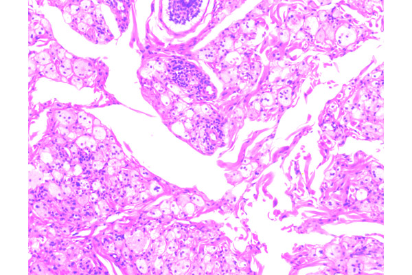 Las células espumosas muestran límites celulares evidentes y el citoplasma microvacuolado.