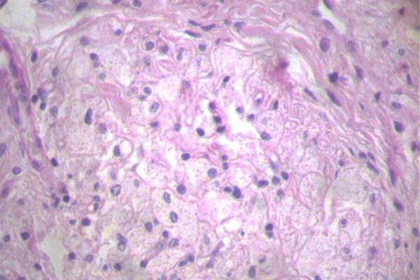 Los macrófagos se transforman en células gigantes, cuyo citoplasma está lleno de vacuolas microscópicas.