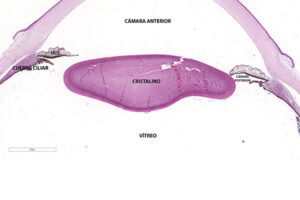 En el cuerpo ciliar las fibras zonulares se unen directamente con las células epiteliales ya sea en los valles ciliares o sobre las superficies laterales de los procesos ciliares pero