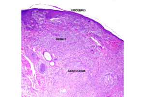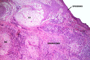 Corte de piel del párpado donde se reconocen epidermis y dermis, esta última con anexos pilosebáceos (GS) y cambios de dermatitis granulomatosa supurativa y crónica. El granuloma está mal formado